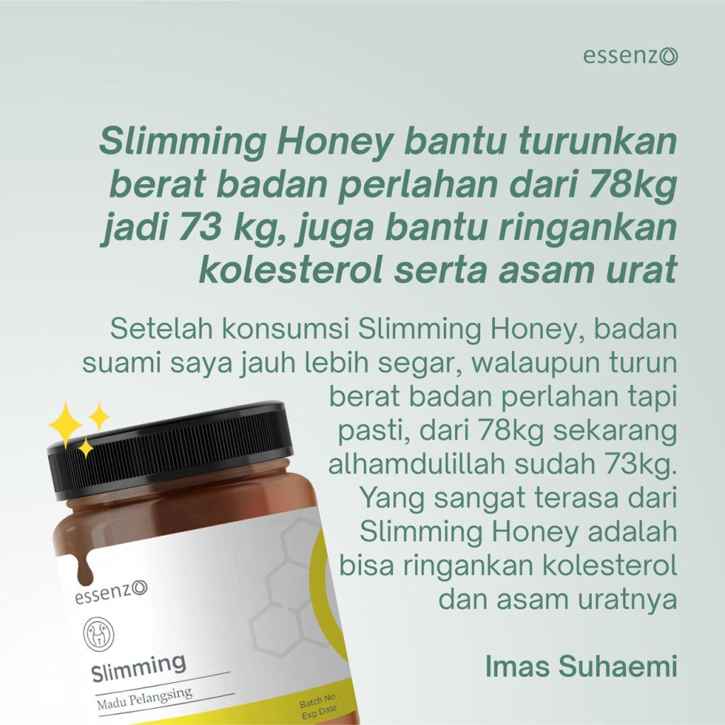 Testimoni Essenzo Slimming Honey solusi masalah berat badan kolesterol dan asam urat serta pencernaan