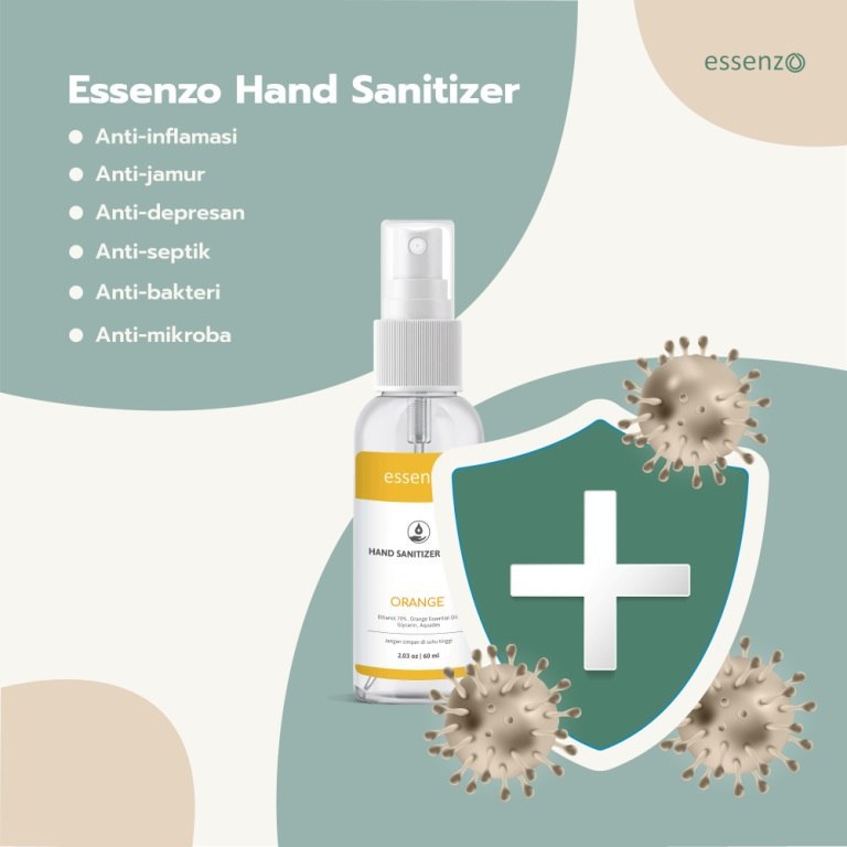 Essenzo Hand Sanitizer Orange Diformulasikan dengan Orange Essential Oil yang berfungsi sebagai anti-inflammatory, anti-septic, anti-viral, anti-microbial, anti-oxidant, anti-fungal.
